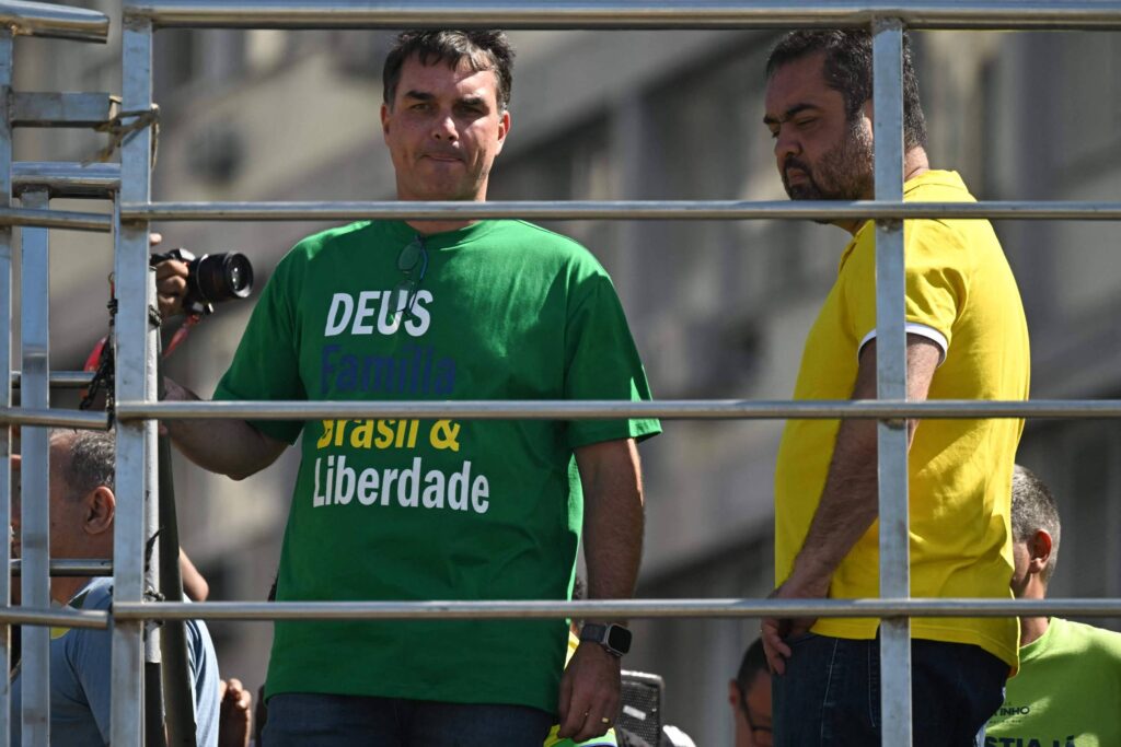 A ex-primeira-dama Michelle Bolsonaro e o senador Flávio Bolsonaro (PL-RJ) representaram a família nos atos bolsonaristas neste domingo (3).